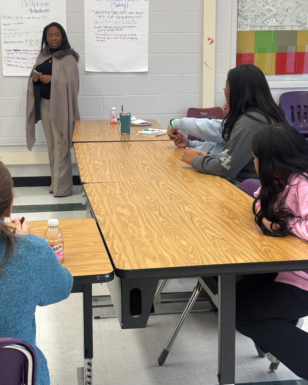 She also connected their input to the way state and local decisions intersect. “The mandate to ban cell phones during the school day comes from the state,” she explained, “but here is where you help to think about the procedures for implementing the policy. And, not just for students, but maybe for teachers and staff as well.” She went on to say that the district needs to think about how the cell phone policy looks at grade bands across the buildings, underscoring the complexity of creating an appropriate policy for all.